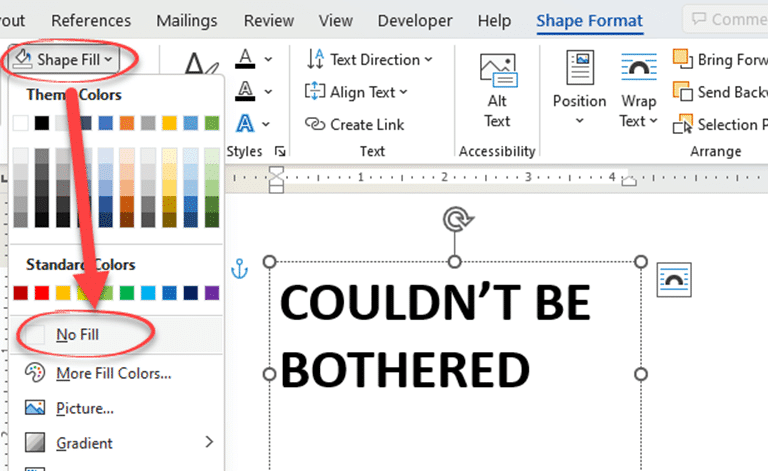 Each Text Box needs some changes to make it both transparent and no outline. On the Shape Format tab: