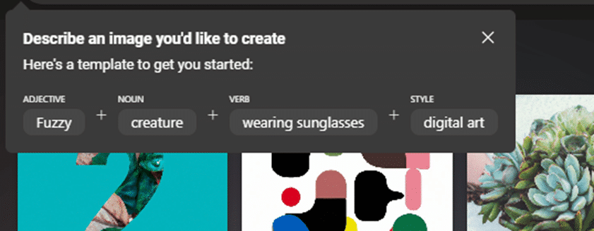 If you’re new to AI image making, try the Explore Ideas tab which has some examples to try or a set of pull-downs to select adjective, noun, verb and a style.