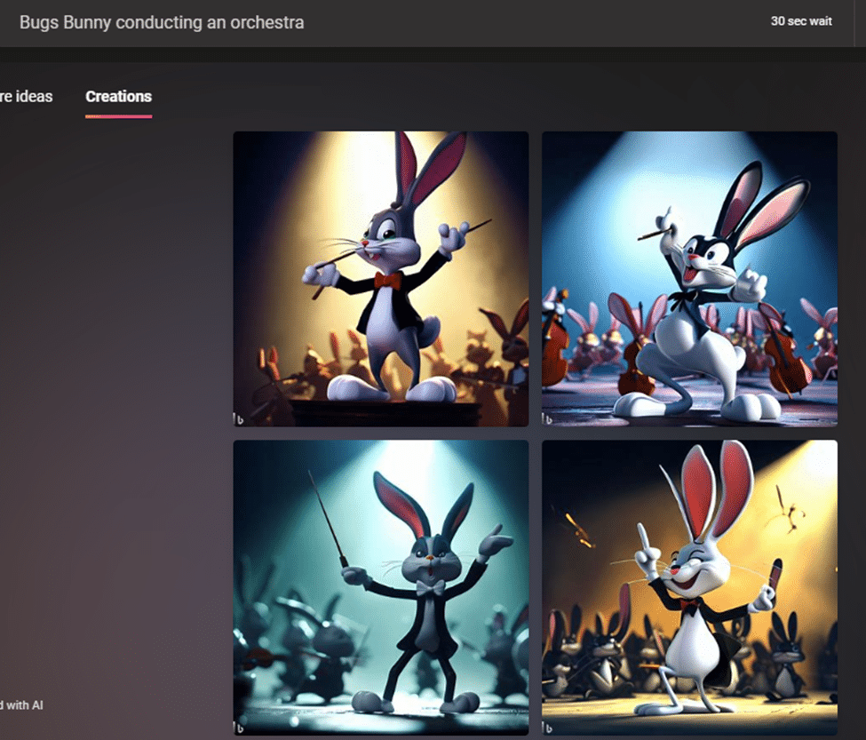 Here’s “Bugs Bunny conducting an orchestra”, though not a great rendering of the Rascally Rabbit. Perhaps Microsoft might be getting a letter from Warner Bros?