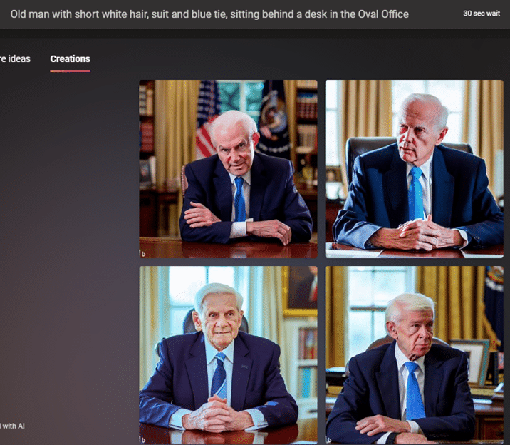 We tried “Joe Biden sitting behind a desk in the Oval Office” and wasn’t surprised to see this: