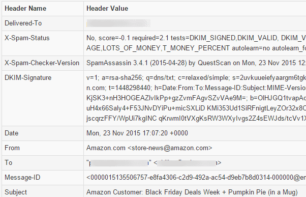 MX Toolbox will take an email header (Outlook calls it message properties) and splits it up into more understandable parts. It starts with a look at the path the message took from the sender to you. Here’s an example message from Amazon US.