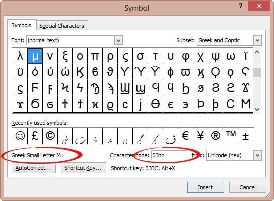 ” I need to use the symbol μ for micron (1/000 mm) and use mu for this. “