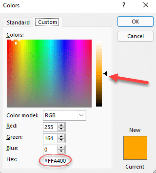 Use the Lightness or Luminance vertical slider to adjust the color either darker or brighter than the base settings. In some Microsoft 365 color selectors there’s also a Transparency option at bottom. The RGB and Hex settings will change accordingly.