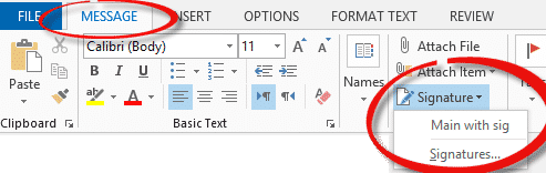 If you’ve already created a signature, you can choose one from the pull-down list and it’ll be copied into the message where your cursor is currently placed. Otherwise choose Signatures …. to see the options.