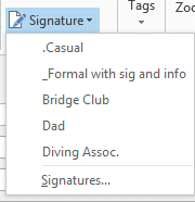 That’s where the pull-down signatures list becomes useful. Here’s an example of signatures for someone with a few ‘hats’ from father, friend, leading member of some clubs plus a full formal signature.