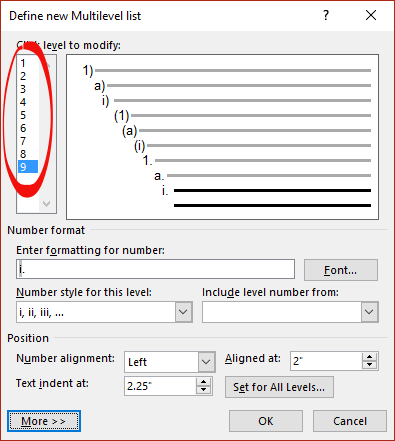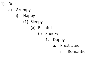 There’s a maximum of nine levels available in Word multi-level numbering. That’s enough for the seven dwarves plus two more. There’s a way to get more than nine levels.