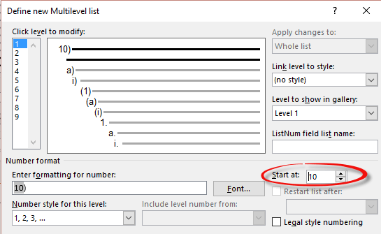 Word multi-level lists, new list, reset numbering and more