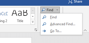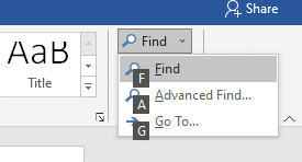 Here’s the options for reaching Word’s full Find dialog quickly. Ever since Microsoft put in the Word Navigation Pane, they’ve messed up access to the Advanced Find dialog box. Ctrl + F doesn’t jump to the Word Find window anymore.