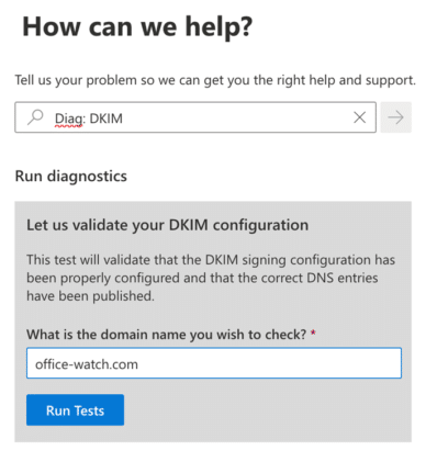 If there are no DKIM lines in the DNS for the domain, you’ll see a notice “No DKIM keys saved for this domain” and either a button to ‘Create DKIM keys’ or a poorly written error message that includes the necessary DKIM settings.