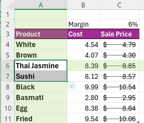 Pressing Ctrl + – removes row 6 (Thai Jasmine) completely. The column is left intact.