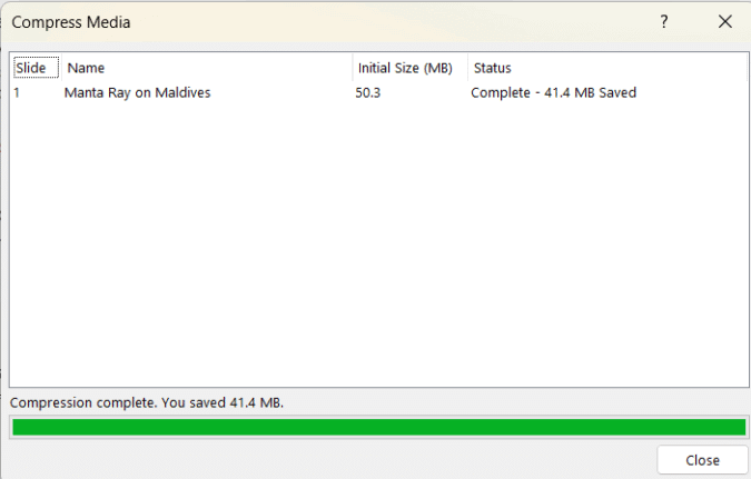 PowerPoint shows the new size (50MB down to 8.8MB) and has the option to Undo the change.