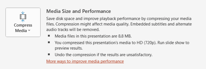 ONLY compress media in a presentation if you have an original video/audio saved separately, either in another version of the presentation or as separate media files. I always keep original / best resolution videos safely separate from anything in a PPTX file — just in case.