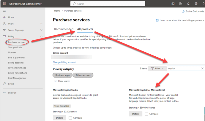 Administrators go to Admin Center | Billing | Purchase Services. It’s not listed under ‘Recommended’ (surely that will be fixed) so go to All products then search for Copilot