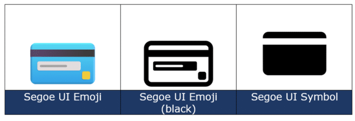 Only two standard Windows fonts have the credit card symbol; Segoe UI Emoji and Segoe UI Symbol.
