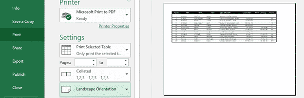 A really useful option to print only the ‘selected’ table. We’ve switched to Landscape orientation so the table fits across a single page.