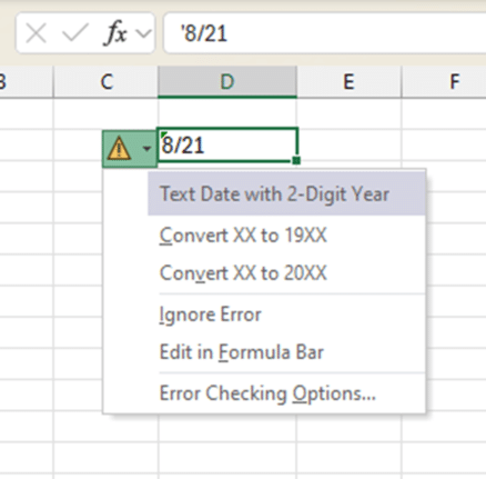 But sometimes Excel wrongly thinks the text has a two digit year when it’s not. This cell has “8/21” as text which could mean August 1921 or August 2021, which is what Excel suspects. But it could also mean the 21st of August, depending on how dates are formatted in your part of the world.