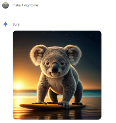 Like other AI systems, you can adjust an image by simply asking for changes instead of rewriting the entire prompt. For example, after the above image we just said “make it nighttime”.