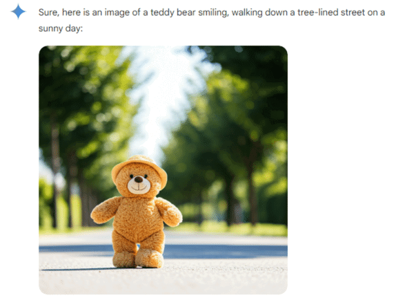 “image of a teddy bear smiling, walking down a tree-lined street, sunny day”.
