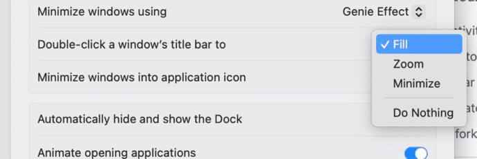 Double clicking on an app title bar has been expanded to include a Fill option.