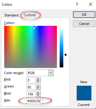 Hex color codes are an option in Microsoft 365, Office 2021 and Office 2019. It seems like a simple change in the Custom Color dialog but Hex Code opens up some useful options.