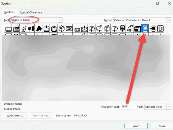 - Search for “ phone “ and the Viewer should find the symbol you need among many phone emoji.
