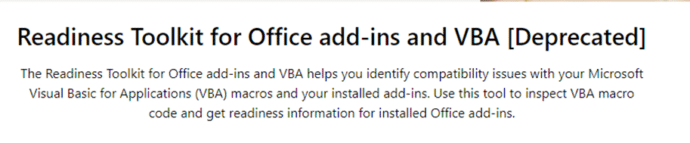 The Microsoft Readiness Toolkit for Office add-ins and VBA is being cancelled (‘retired’) from the end of March 2024.