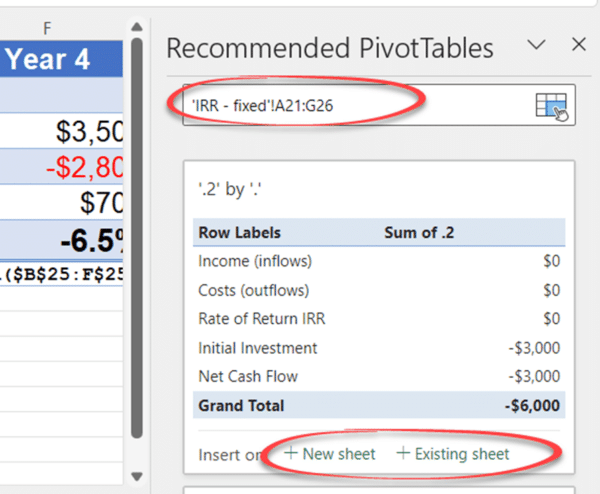 It’s now possible to change the source data for PivotTable recommendations without leaving the pane. Click in the top Source field then either edit the range listing or simply choose another table in the workbook