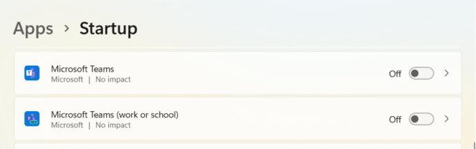 Go to Settings | Apps | Startup then change the slider to ‘Off’ for the Teams app/apps.
