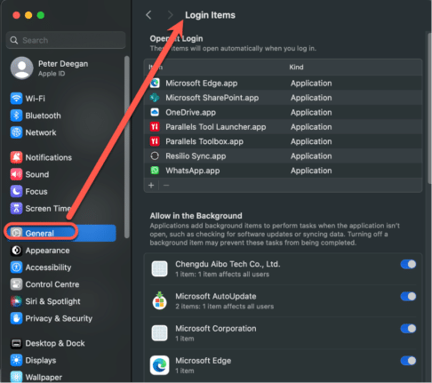 On Mac computers go to Apple | System Settings | General | Login Items.