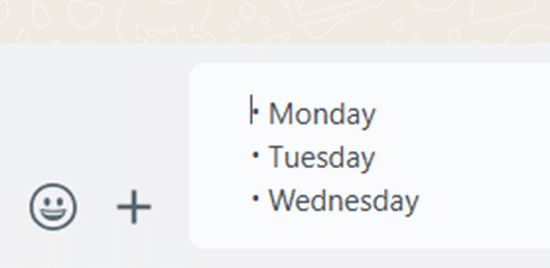 As you probably know, pressing the Enter key in WhatsApp will send the message. So how to you make a multi-line list (bullet or numbered) with the new shortcuts? (In Word and PowerPoint, pressing Enter in a list will add a new list item, but not in WhatsApp).
