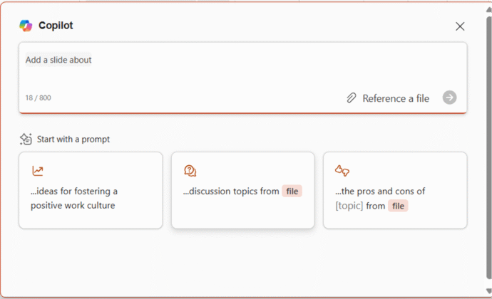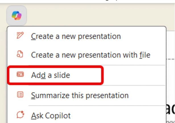 Or there’s “Add a slide” on the Copilot icon top-left of a slide.