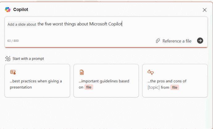 Copilot can’t accept formatting requests “Make the slide heading larger and red” and sometimes ignores slide design prompts.