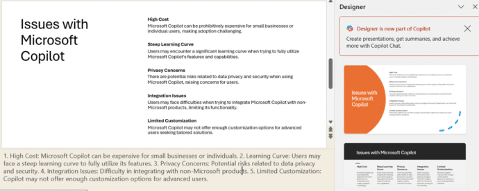 This is a welcome Copilot addition instead of ‘over the top’ AI offers to make a whole presentation. Copilot offers to make a single slide makes more sense. Importantly, it’s discreet, just a ribbon button not intruding into the slide workspace.