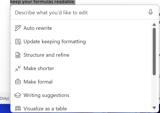 In Word 365 with Copilot you can select text then the Copilot icon at left to see a menu a bit like this (Microsoft often changes it).