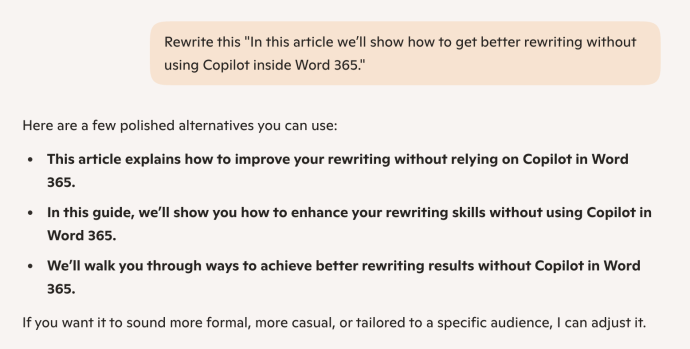 In this article we’ll show how to get better rewriting without using Copilot inside Word 365. You can use the “Auto Rewrite” option in Word in much the same way that we’ll explain here. AI might not give a perfect answer, but it can give you some big hints or at least free you from the dreaded writers block.