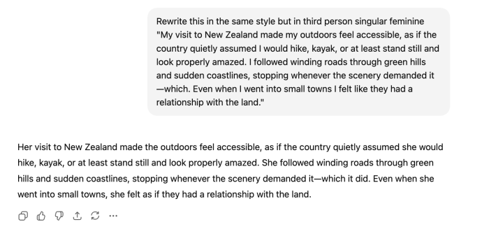 Also change between singular/plural masculine/feminine. E.g. “Rewrite this in the same style but in third person singular feminine”
