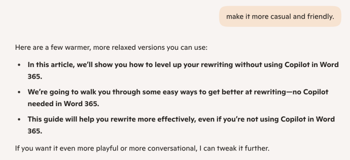 Get a more useful response by giving a writing style to use. With modern AI ‘chat’, there’s no need to repeat the whole question/prompt, just add another ‘follow on’ request such a “Make it more casual and friendly”.