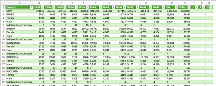There are general 2025 enrolment statistics available including breakdowns by state, division (electorate), age and gender. With some help from Excel’s Get and Transform, a workable spreadsheet appears.