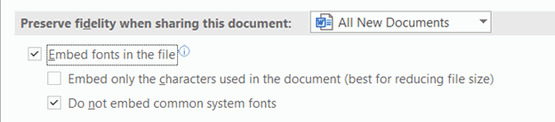 Embedding fonts includes the font file in the document. It’s still necessary for documents being shared with users of older Office versions. File | Options | Save | Preserve fidelity when sharing this document.
