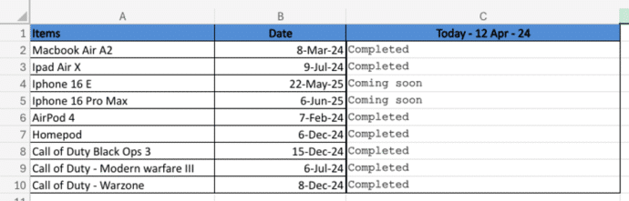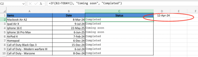 This formula evaluates the dates in column B. If the date is 12 April 2024, or later, it returns “Future”; otherwise, it returns “Completed” for earlier dates.
