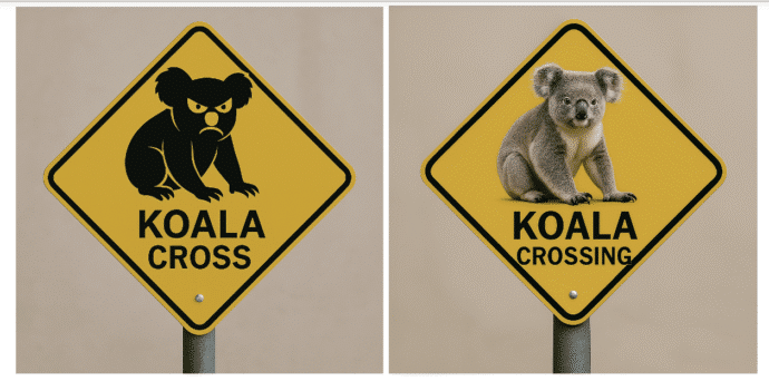 Copilot should now be a lot better at showing the exact text you ask for, even your spelling mistakes. For example “make a image of a road sign that says ‘Koala Cross’ with a graphic of a koala”.