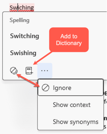 Add to Dictionary – puts the word into the Word dictionary so it won’t show as a spelling error in any document. Strictly speaking, it’s added to a Custom Dictionary.