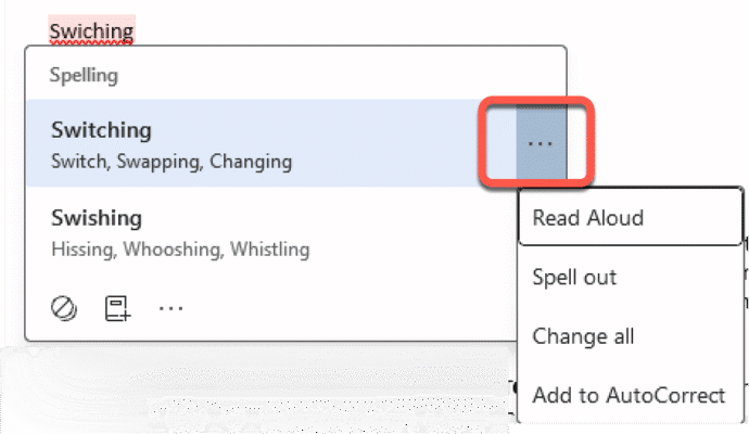 Show context – before the spelling suggestions, the sentence or phrase appears. Click on the speaker icon to hear the sentence read aloud.
