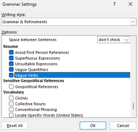 In Word for Mac, File | Options | Preferences | Spelling & Grammar | Writing Style | Grammar & Refinements | Settings, the same settings are available, in the same order as in WinWord. But without the headings, it’s even harder to navigate. The ‘Resume’ settings are there starting with “Avoid First Person References”.