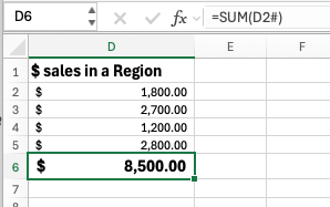 Notice the Sum() reference in D6 has the starting cell (D2) plus the pound/hash # symbol which tells Excel to use all the cells below.