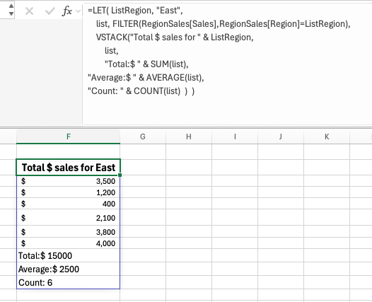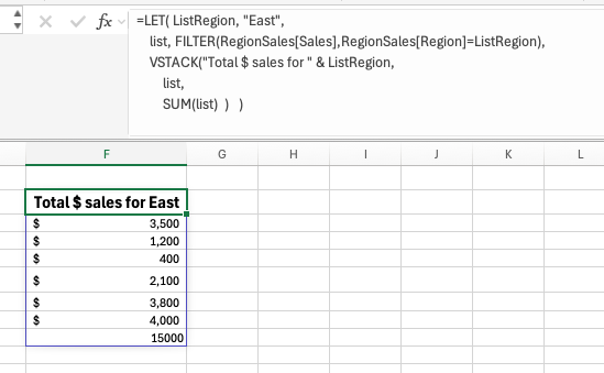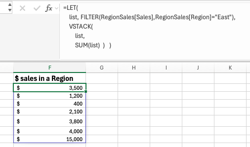 VSTACK("Total $ sales for " & ListRegion,