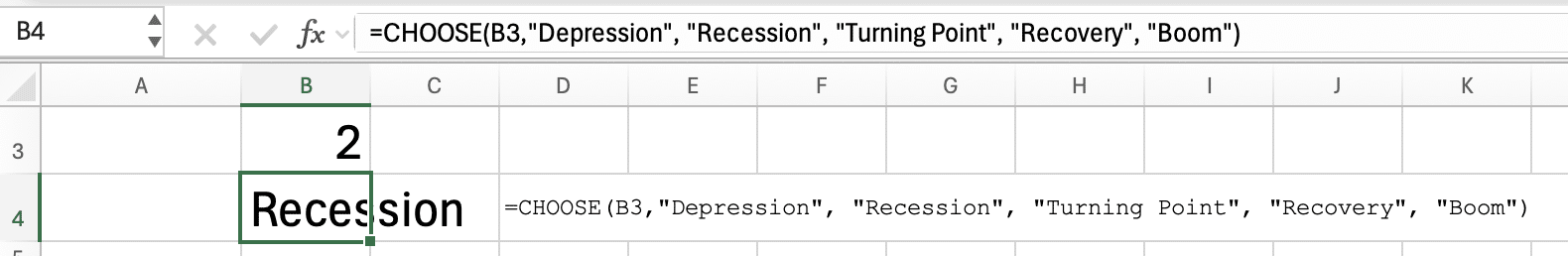 =CHOOSE(B3,"Depression","Recession","Turning Point","Recovery","Boom")
