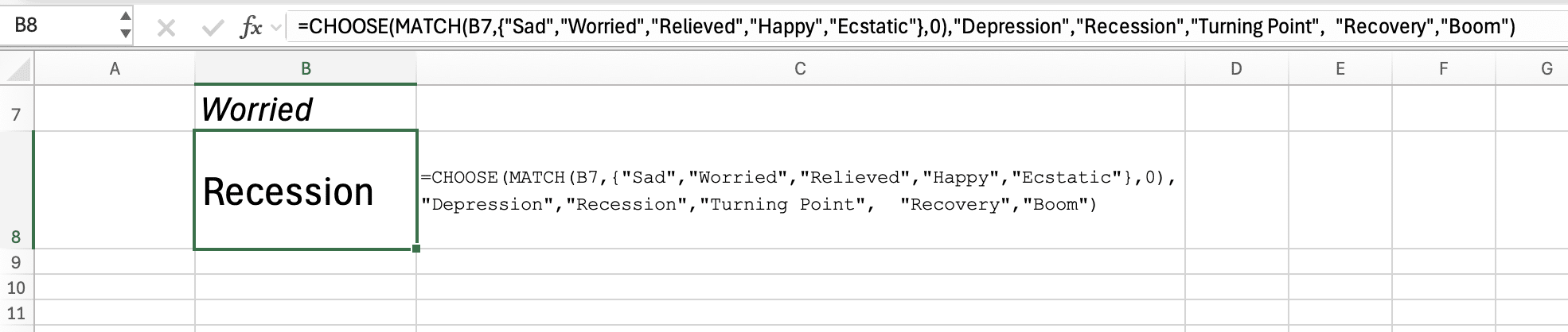 (This example works by MATCHing the text in cell B7 with the { array } which returns a position number e.g. Worried = 2. That position is used by CHOOSE to find one of the other terms, e.g “Recession”. .