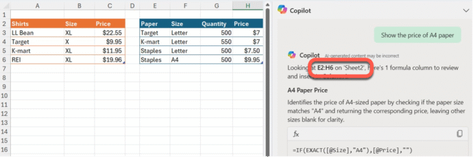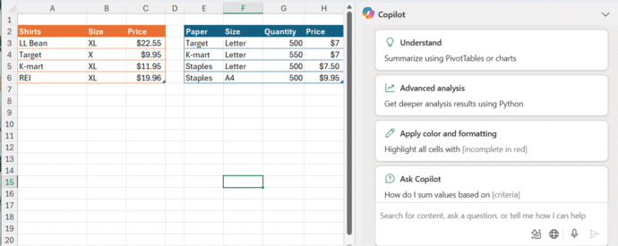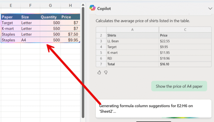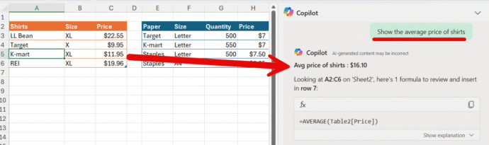 In practice, ask Copilot “Find the average price of shirts” and it will find the right table, ignoring the rest and give the result in various forms.