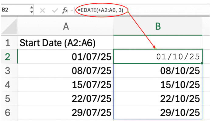 This function returns the date that’s 3 months ahead of each date in A2:A6.